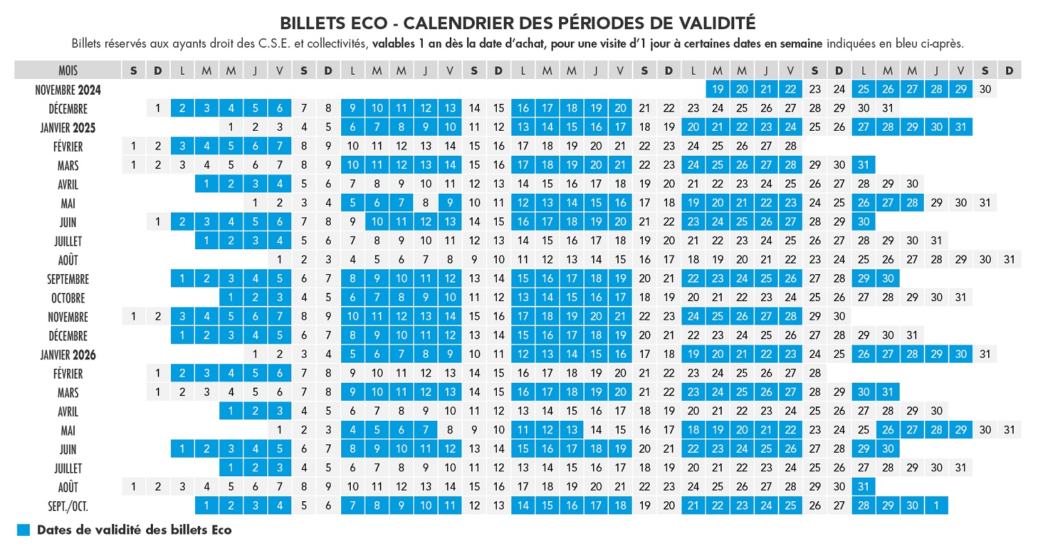 Billet Eco valable 1 an dès la date d'achat, pour une visite en semaine, hors dates officielles des vacances scolaires des zones A à C, hors ponts et jours fériés