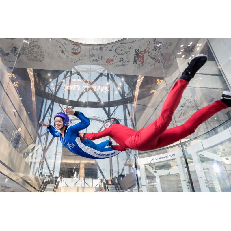 Lors du premier vol, il s’agit de découvrir l’élément et la stabilité d’un vol allongé sur l’air. Un écran retransmet en permanence le vol précédent pour que vous puissiez vous regarder à l’issue. Lors du second vol et selon votre aisance, les passagers qui le souhaitent, pourront expérimenter l'incontournable "FLY UP" (en option) et décoller à plusieurs mètres de hauteur, tout en étant aidés du moniteur. A la fin de votre initiation, le moniteur effectuera une démonstration sportive de chute libre indoor. Effet bluffant garanti !