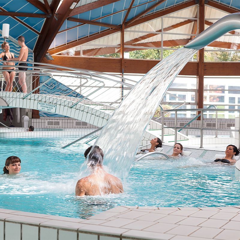 Retrouvez des bassins intérieurs et extérieurs en eau thermale chaude, buse de massages, sièges et lits hydromassants. Rivière à contre-courant, cascade et bain froid. Hammam, sauna, sanarium