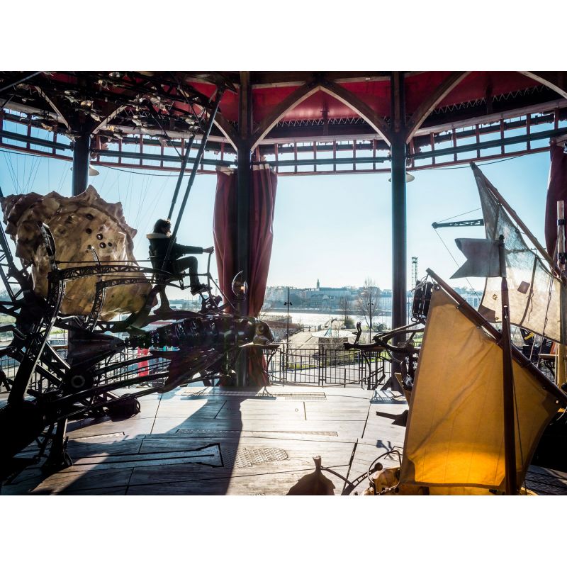 Situé en bord de Loire, face au Musée Jules Verne, le Carrousel des Mondes Marins semble sortir du ventre de l’Île de Nantes, à l’endroit le plus maritime de la ville. Adultes et enfants plongent dans le même imaginaire avec cet incroyable aquarium mécanique que vous découvrez à votre rythme. Source et informations sur : https://www.lesmachines-nantes.fr/decouvrir/le-carrousel-des-mondes-marins/